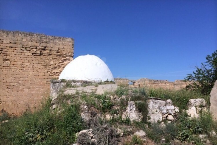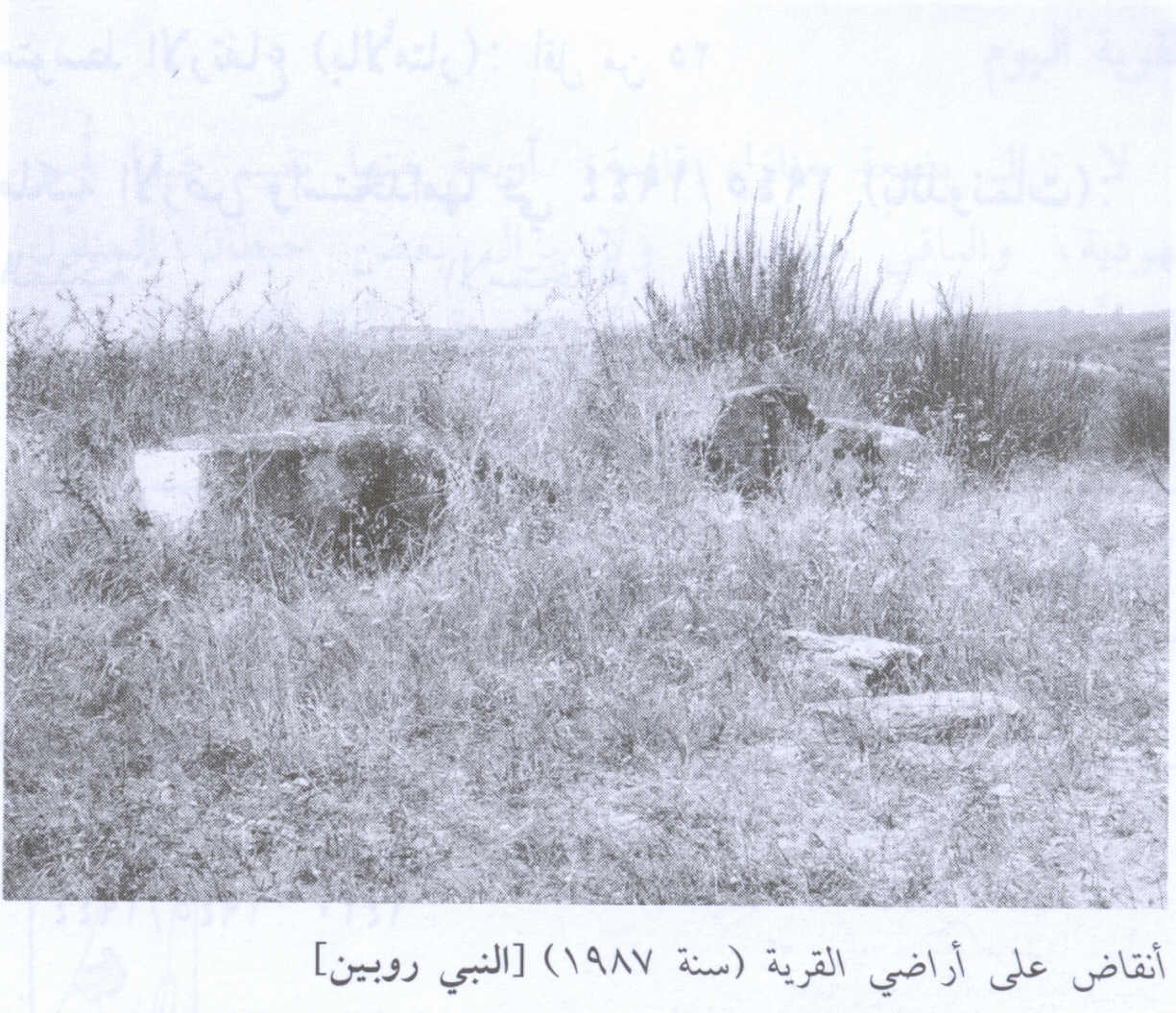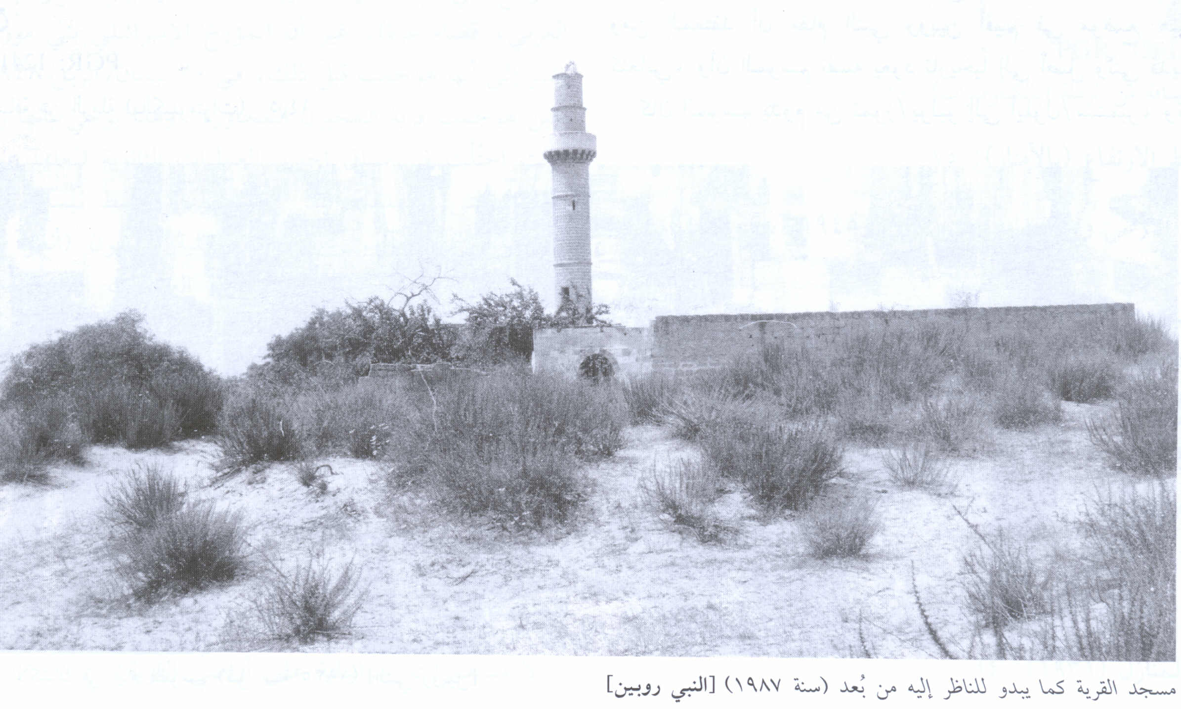 "The shrine of al-Nabi Rubin stands amid shrubs and other wild vegetation. A minaret that has three lancet-arched entrances stands at one end of it. A number of minor shrines built of large stones also remain. Near the shrine is a deserted, free-standing cement structure that consists of a single, box-shaped room."