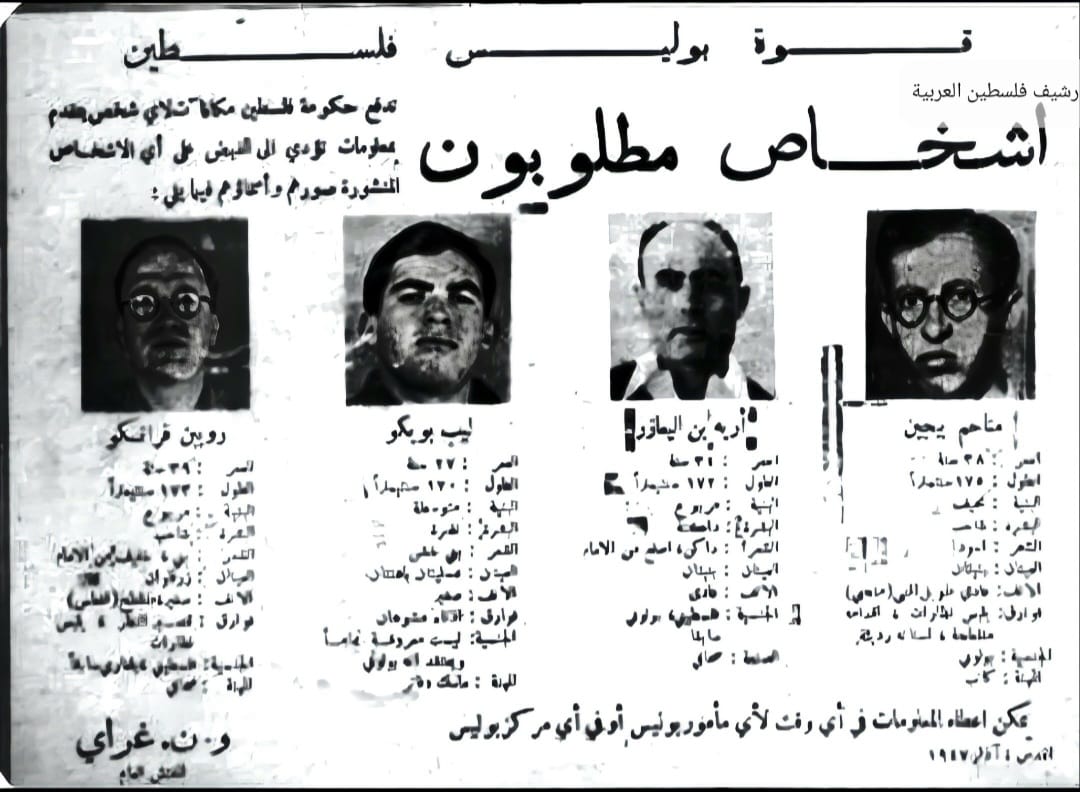 Wanted Poster of the Palestine Police offering rewards for the capture of the Stern Gang terrorists: 1) Yaacov Levstein 2) Yisthak Shamir 3) Natan Friedman-Yelin 4) Yaacov Levi 5) Moshe Bar-Giora 6) Yehoshua Cohen