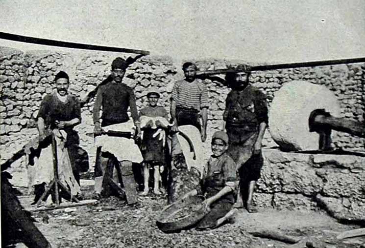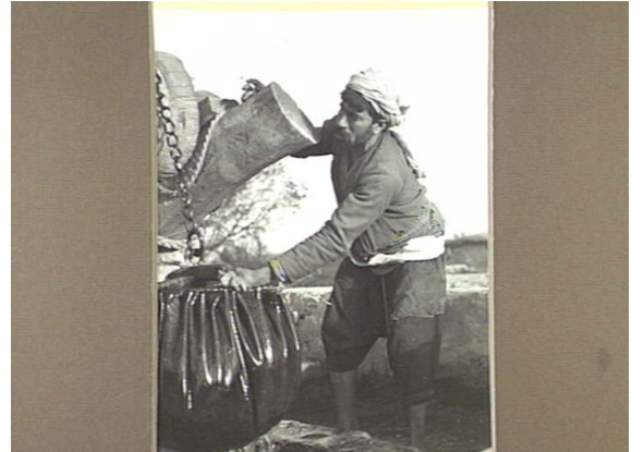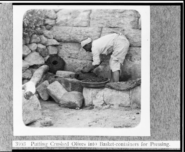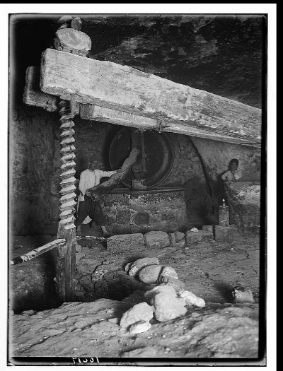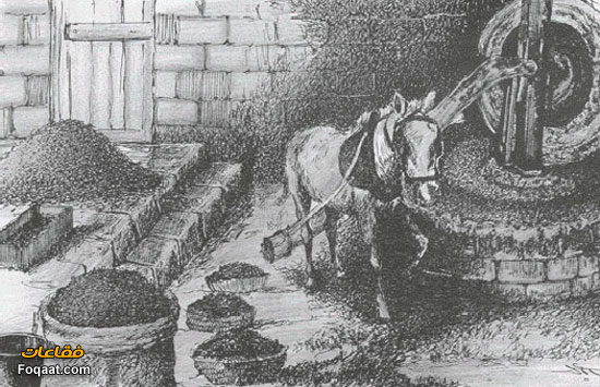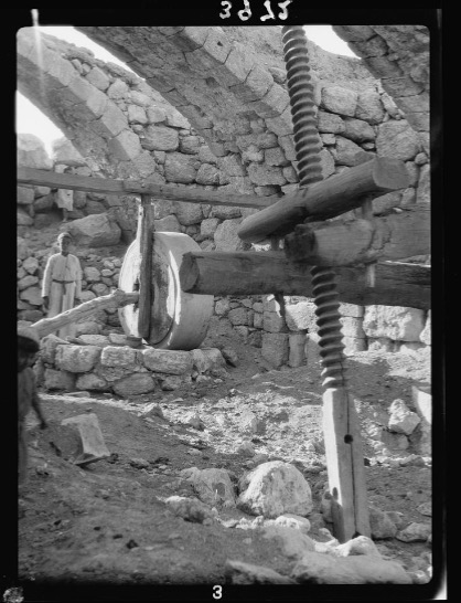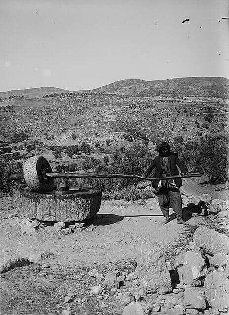 - فلسطين 1900 - معصرة بدائية تعمل بمساعدة الجمال لاستخلاص زيت السمسم